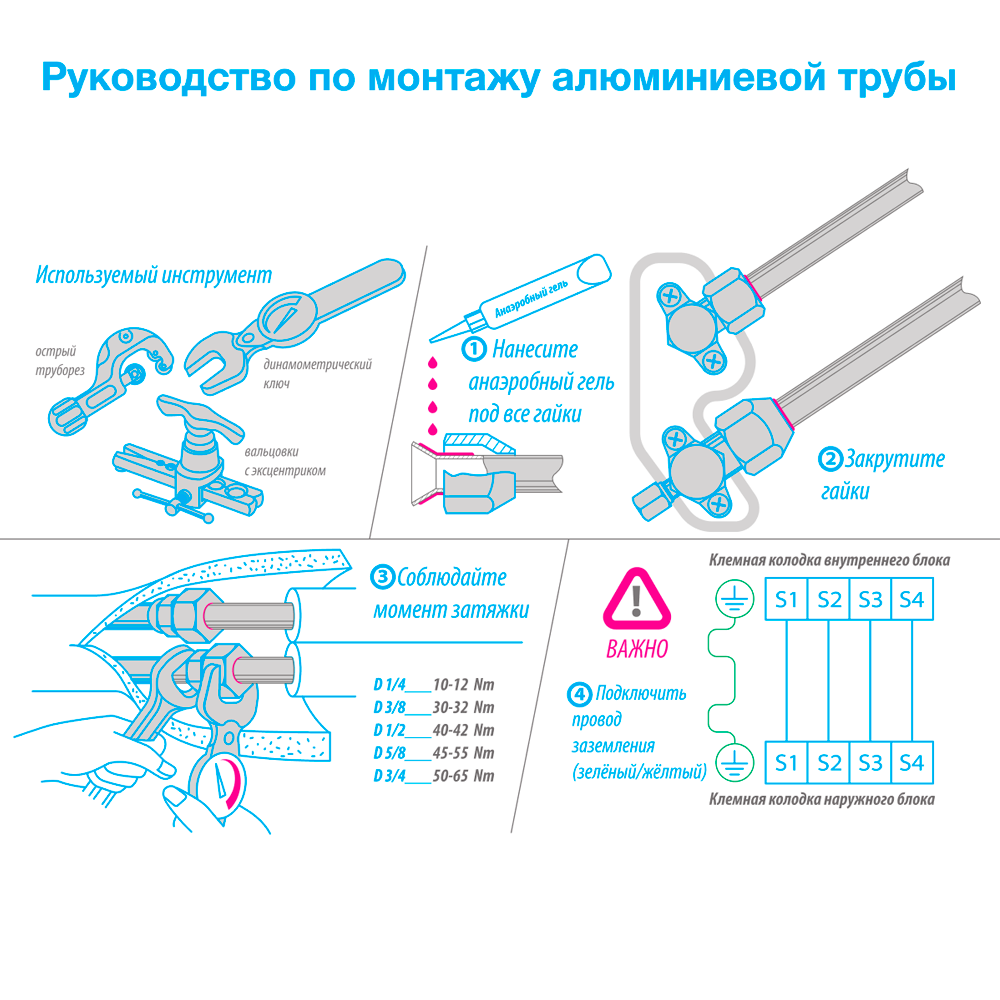При использовании алюминиевых труб для монтажа кондиционеров, нужно обязательно соединять проводом колодки заземления между внутренним и внешним блоком кондиционера.