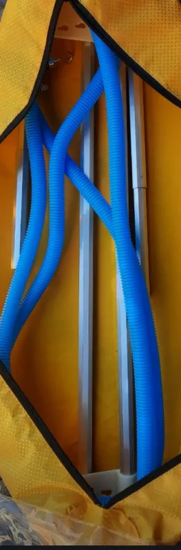 Чехол изготовлен из прочной водонепроницаемой ткани, имеет каркасную регулируемую конструкцию для простоты использования с различными по размерам блоками кондиционеров. К чехлу из ткани при помощи специальных застежек присоединяется силиконовый чехол для удобства дренажа.