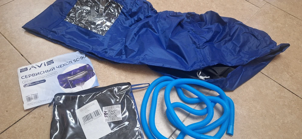 Сервисный чехол для кондиционера BAVIS SC-90 предназначен для очистки и мойки внутреннего блока сплит-системы при сервисном обслуживании. Подходит для блоков кондиционера настенного типа мощностью 7, 9, 12 BTU и длиной 900-300 мм. В комплекте дренажный, гофрированный шланг.