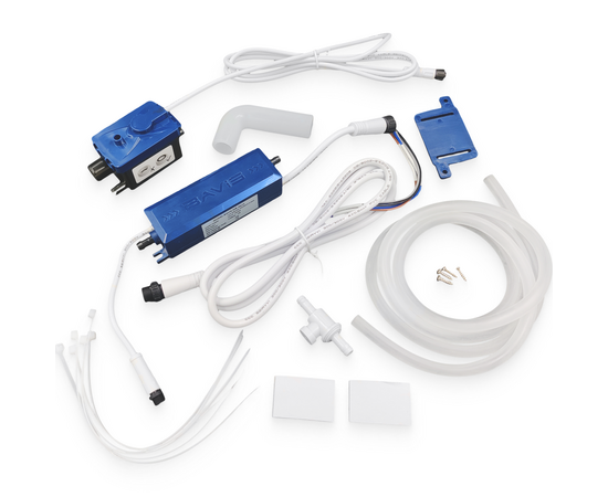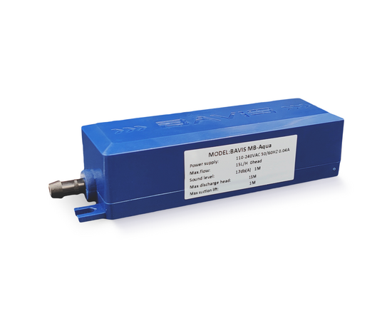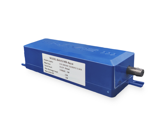 BAVIS MB-AQUA — помпа проточного типа производительностью 15 л/ч для отвода конденсата от бытовых и полупромышленных систем кондиционирования. Устанавливается в корпусе внутреннего блока, над потолком, в кабель-канале или в дренажной магистрали. Помпа состоит из насосного блока (качающий узел) и резервуара с поплавковым датчиком уровня воды.