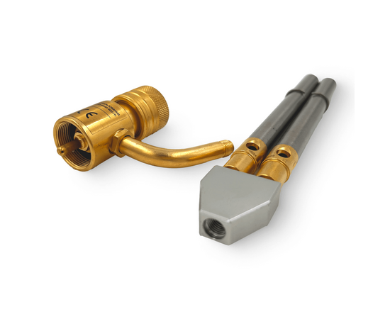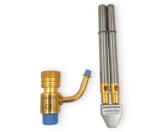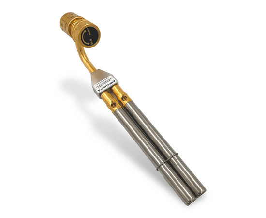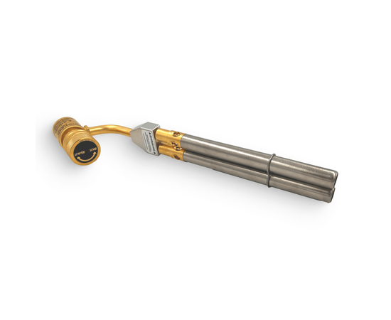 Благодаря двум наконечникам достигается эффективное пламя, особенно подходит для пайки больших деталей и заготовок или горячей обработки металла. Наконечники поворачиваются на 360°, благодаря чему горелка подходит для работы в сложных условиях.