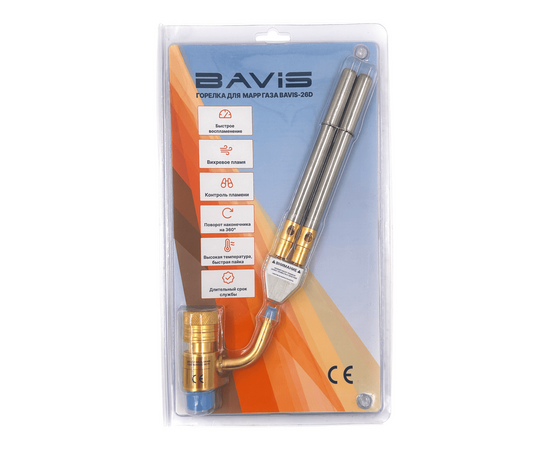 Горелка для MAPP газа BAVIS-26D с двумя соплами, латунным регулятором пламени, встроенным редуктором давления, функцией антивспышки. Тип пламени: Вихревое.