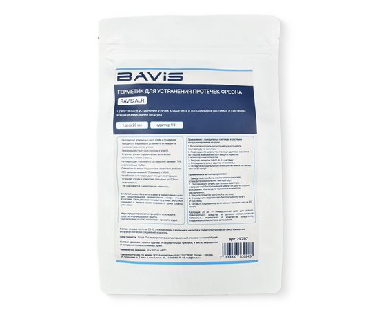 BAVIS ALR - средство для устранения утечек хладагента в холодильных системах и системах кондиционирования воздуха. Совместим со всеми  хладагентами и маслами, включая СО2 (за исключением R717 (аммиак) и R600). Объем: 1 доза 20 мл.