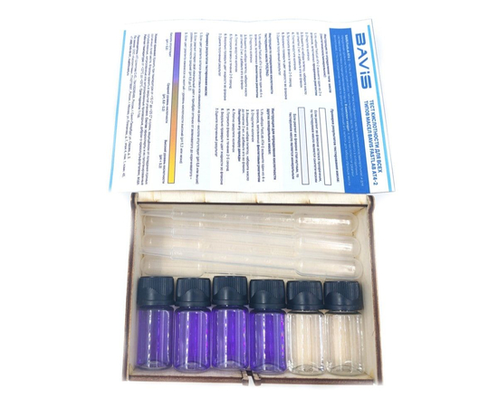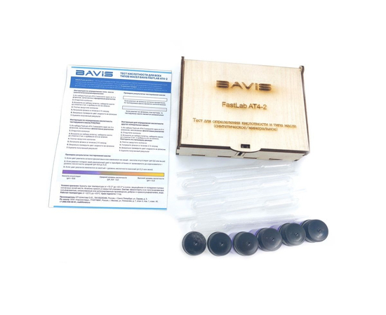 Тест кислотности для всех типов масел BAVIS FastLab AT4-2 предназначен для определения типа и кислотности уровня pH холодильного масла. Комплект состоит из 6 тестов с пипетками для взятия масла на образец. Четыре теста определяют уровень pH (цвет реагента - фиолетовый) и два теста определяют тип масла (синтетическое/минеральное).